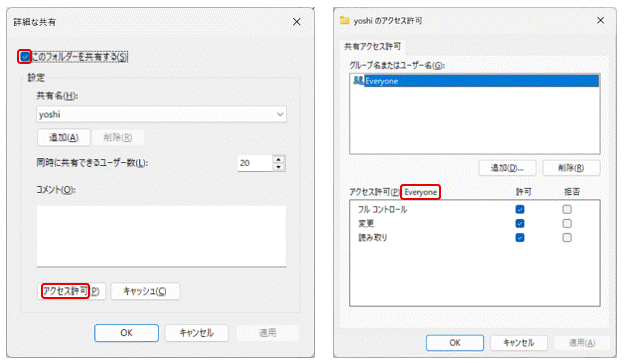 下図右の「yoshiのアクセス許可」が開くので、コントロール・変更・読み取りの「許可」に✔して、「Everyone」にアクセス権が許可されたことを確認します。最後に下方の「OK」~「OK」~「閉じる」と順に前に戻り、フォルダの共有設定を終えます。