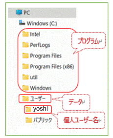 具体的にデータの「共有」設定をしてみましょう。Windowsではプログラムやデータを保存するストレージは、右図のように大きくプログラムとデータ(ここではユーザー)に分けて保存します。さらに、個人データは「ユーザー」の下の「個人ユーザー名(ここではyoshi)」の中に保存するのが一般的です。