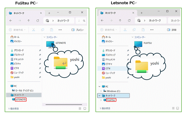 下図左は「Fujitsu PC」が相手の「LETSNOTE」を検出している画面です。下図右は「Letsnote PC」が相手の「FUJITSU」を検出しています。検出した相手のアイコンをクリックすると、吹き出し内の「yoshi」フォルダが現れて、その「yoshi」フォルダの内部を自由に操作することができます。ちなみに、吹き出し内のフォルダの緑の下線は「共有」を意味しているようです。