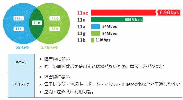 無線LANの規格「Wi-Fi 規格」には下図のようなものがあります。これを見るとルータに使われるWi-Fi 規格は、5GHz帯と2.4GHz帯の2つの周波数帯域に分けられます。5GHz帯には「11ac」と「11a」、2.4GHz帯には「11g」「11b」、両方の周波数帯に使える「11n」があります。