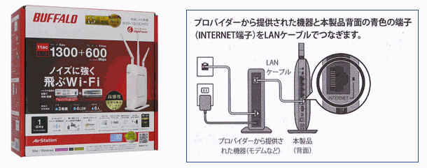 以下の説明は WXR-1900DHP2を例に、配線から設定までを具体的に記していきます。下図右はルータWXR-1900DHP2の配線図です。まず、この配線図に従って電気接続をします。下図で「プロバイダから提供された機器」とは、光回線では光端末(回線終端装置ONUなどともいう)のことです。これらの機器がプロバイダから提供される場合は、ONUとルータを一つのケースにまとめたものや、ルータと電話アダプタを一つのケースにまとめたものなどもあります。