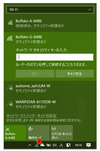 赤矢印で示す「電波印のアイコン」をクリックして設定画面を出します。設定したいSSIDを選択して「接続」をクリックし、暗号化キー(右図ではネットワークセキュリティキー)を入力して「次へ」を押します。これでパソコンはルータに自動的に接続されます。