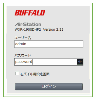 BuffaloのWXR-1900DHP2では、インターネット接続用の「ユーザー名とパスワード」の設定が必要です。前項でパソコンがルータと接続されると、Buffalo製品では「Internet回線判別中」の画面が表示され、ここで「Internet側の確認を行う」をクリックします。すると、右図のようにルータWXR-1900DHP2へのログイン画面が現れるので、ユーザー名とパスワード(取説にadminとpasswordの記載あり)を入力します。