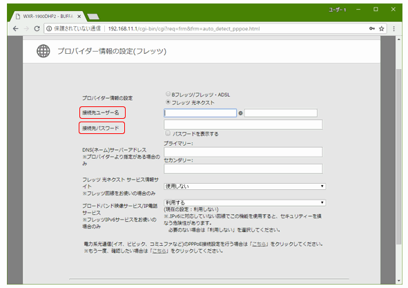 ルータに「ログイン」すると、下図「プロバイダ情報の設定」画面が現れます。ここでプロバイダからもらったインターネット接続用の「ユーザー名とパスワード」を設定して「進む」ボタンを押します。