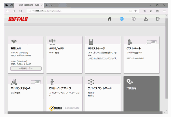 ちなみに、ルータもLANに接続されたコンピュータの一種と考えることができます。ブラウザを開いてURL欄に、ルータのIPアドレス「192.168.11.1」(取説に記載あり)を入力すると、前項と同じルータへのログイン画面が現れます。ユーザー名とパスワード「admin/password」(取説に記載あり)を入力すると、下記のルータ全般の設定画面が現れます。ここでルータWXR-1900DHP2の現状確認や設定変更ができますが、通常は触れないでください。