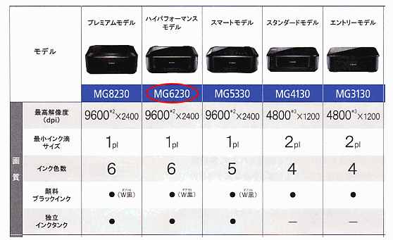下図はCanon Pixusプリンタのカタログから印刷画質に関わる部分を抜き出したものです。私はMG6230を使っていますが、この機種を例にプリンタの持つ画質性能について考えてみます。