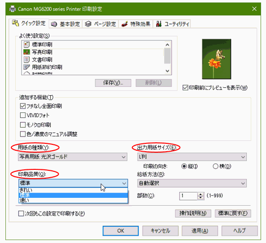 写真印刷では「きれい」に設定します。デフォルト値の「標準」では、プリンタはフル能力を出しません。一般の文字印刷はデフォルトの「標準」で印刷されます。必要以上の「印刷品質」を設定しても、印刷時間とインク量を無駄づかいするだけです。
