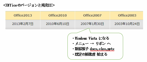 この既定の解像度の仕組みは、下図のように Windows Vista(Office2007)から始まりました。そして既定の解像度の値は、Office2013までは「96ppi,150ppi,220ppi」の3つ、Office2016では「330ppi,高品質」の2つが増えましたが、すべてのバージョンでその初期値は「220ppi」です。ちなみに、Office2003以前は貼り付けた画像はそのまま保存する仕組みになっていました。この「