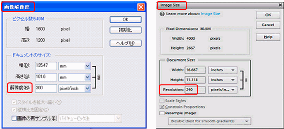 Image Size」であることが分かります。そして下図右の「Resolution」は、「印刷画像サイズを算出するプリンタの解像度」を意味します。ここでも「