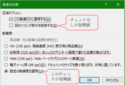 トリミングした部分を削除するかなど、個々の画像ごとの設定をすることもできます。編集したい画像を選択して「書式」タブ~「調整」グループの「図の圧縮」から、上図の「画像の圧縮」画面で設定します。図の吹き出しの内容に注意しましょう。作業を始める前は「図のトリミングを削除する」のチェックを外しておくと、後にトリミングの再調整が可能になります。最終的にはこのチェックを付けると容量が少なくてすみます。
