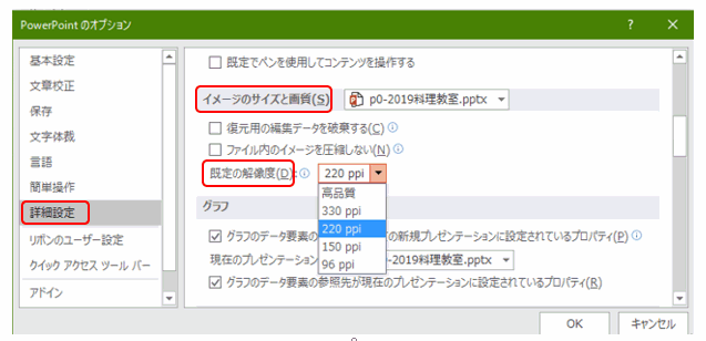 Officeに貼り付けた大きな画像を編集をして保存すると、「既定の解像度」で指定された印刷画像サイズ(画素数)に縮小(余分な画素を削除)して保存する仕組みなっています。例えばPowerPointでは「ファイル」~「オプション」から下図「PowerPointのオプション」を開き、「詳細設定」~「イメージのサイズと画質」~「既定の解像度」を「220ppi」などと指定できます。