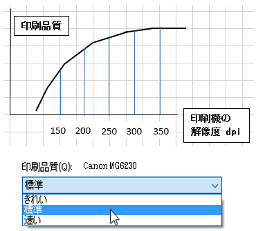 右図上は「印刷機の解像度と印刷品質」の相関を示すイメージ図、右図下は私のプリンタCanon MG6230の印刷品質の設定図です。印刷に先立ち「きれい」「標準」「速い」などの印刷品質の設定をすれば、プリンタは 例えば330dpi・220dpi・150dpiなど、自動的に自身の解像度を落として(速度を速めて)印刷します。ちなみに、350dpiを超える画素数の画像はPCが重いだけで印刷品質の向上にはなりません。
