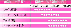 下の図表は、Epson PM-840Cインクジェットプリンタの取説から抜粋しました。各印刷モード(品質)で、理想的な印刷結果を出力するための「画像データの解像度の目安」です。このプリンタではそれぞれの印刷モードにおいて、画素対応で100~400dpi
