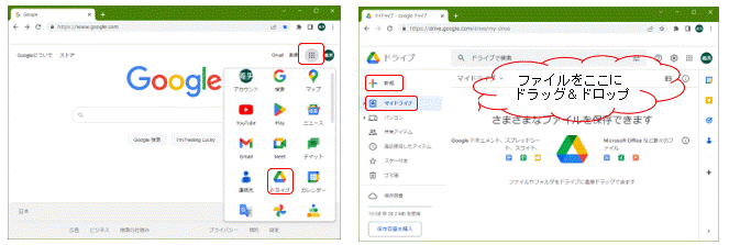 Googleのホーム画面(https://www.google.com)を開き、その右上にある「アプリ一覧」アイコンをクリックします。さらに、その下方にある「ドライブ」を選択すると、下図右の「Googleドライブ」のトップ画面になります。左列の項目は「マイドライブ」が選択されています。