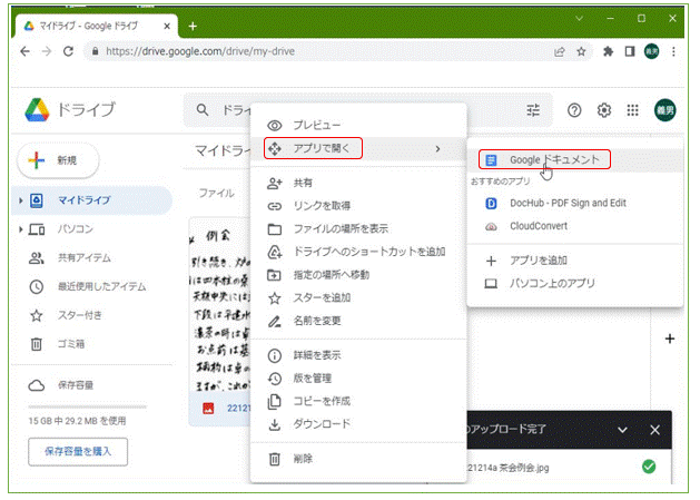 下図「Googleドライブ」にアップロードした画像ファイルを選択して、右クリック~「アプリで開く」~「Googleドキュメント」を選択します。この操作でGoogleドライブのOCRの読み取り機能が実行され、結果が「Googleドキュメント」に出力されます。