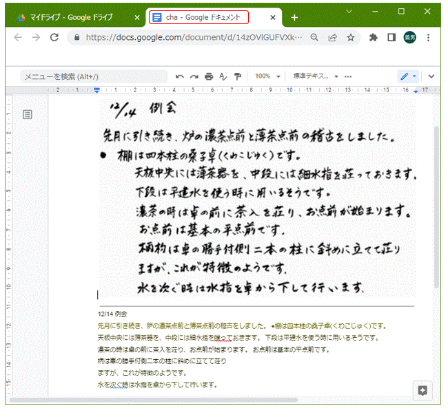 GoogleドライブでのOCRによる文字の電子化(テキスト化)には少し時間を要します。その後、OCRの結果は下図のように