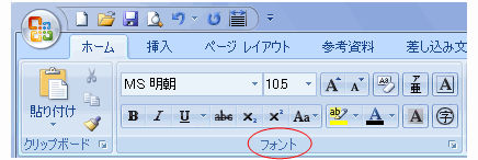 この「フォント」グループで操作する書式が、フォントを明朝体にする、フォントサイズを大きくする、太字にする・・・などの「