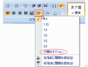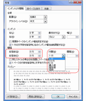 もう少し細かい行間設定をしたいときは、上図の「行間のオプション」を押すと下図が現れます。「段落」のダイアログボックスランチャーをクリックしても同じです。