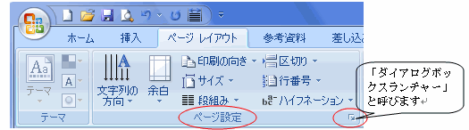 ただ、私にはこのデフォルトの余白が大きすぎるので、この余白と関連する設定を変更して使っています。Word2007での設定は、「ページレイアウト」タブ~「ページ設定」のダイアログボックスランチャーをクリックして「ページ設定」画面を開きます。