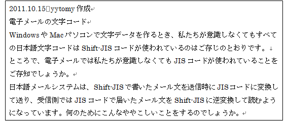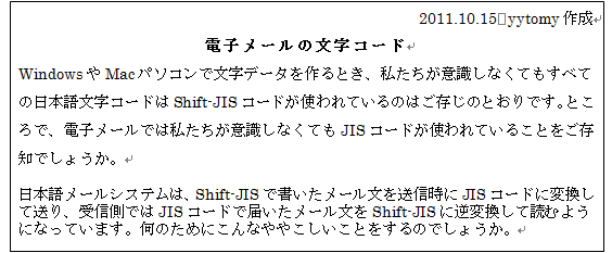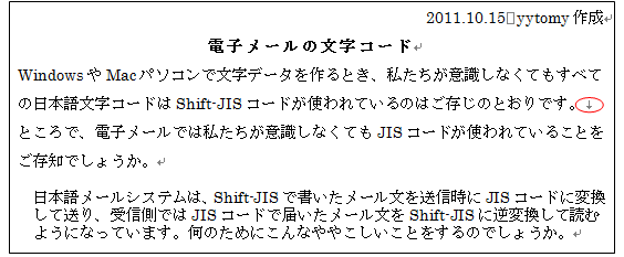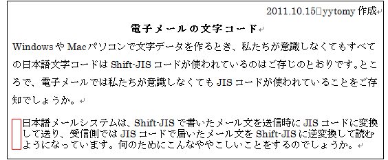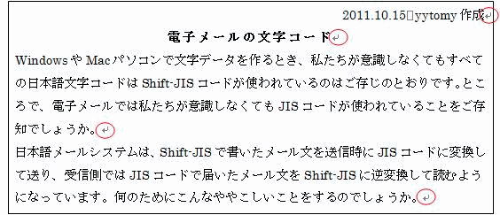 上記の文例の「2011.10.15 yytomy作成」は右揃え、表題「電子メールの文字コード」は中央揃えになっていますが、これらは段落ごとに設定される書式です。段落の選択は「