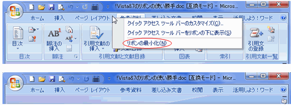 そこで考えられたのが、リボンを一時的に最小化して縦方向の文書作成面積を広く使うことです。下図上段のリボンを最小化すると、下段のようにタブのみが残った状態になります。