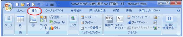 タブの内容を示します。Word2003でよく使った表、クリップアート、図(写真やクリップアートなど)、図形、ページ番号、テキストボックスなどの挿入ボタンがここに納められています。