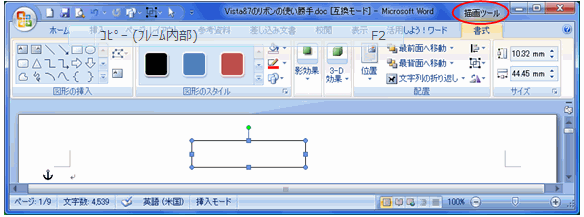 Word2007ではリボン全体の表示が見にくくならないように、一部のタブは必要なときにだけ表示されます。例えば「挿入」タブ~「図形」から、用意された標準図形を使って下図のような四角形を描くと、タイトルバーに「