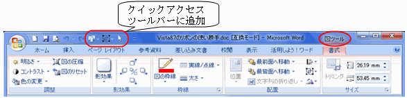 クイックアクセスツールバー」に追加しておくと便利です。私は上記で太字で示した「図形」「オブジェクトの選択」「グループ化」の3つのコマンドを追加しました。下図の赤枠で囲んだ3つです。