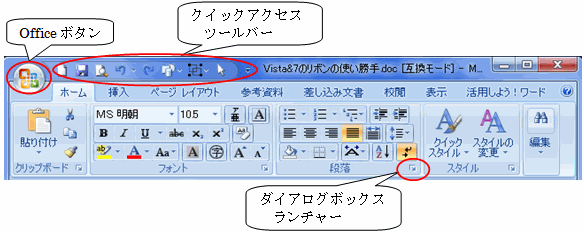 今まで述べてきた主な機能の他に、関連してよく使う機能があります。それは下図の吹き出しで示した3つです。「Officeボタン」は次項で述べますので、ここでは他の2つについて簡単に触れます。