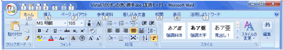 Office2007のリボン操作を、キーボードだけで操作することもできます。「Alt」キーを押すとキーヒントが表示されるので、それらの文字を順に入力すればよいのです。「Alt」キーを押すと、リボンに文字が出てきます。