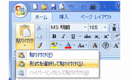 この機能は古くからあり、Word2003までは Webページの文字をWordに取り込むとき上記のようにしてきました。Word2007ではこの操作の「形式を選択して貼り付け」が少し簡単にできるようになりました。