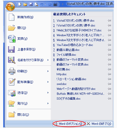 オプション」の内容は、Word2007では妙なところにあります。前項で触れたように、Officeボタンで示されるドロップダウンメニューの最下段にあります。