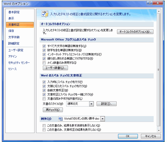 下図は「Wordのオプション」の「文書校正」を選択した場合を示しています。Word2003にあった「オプション」の多くの項目と、「オートコレクトのオプション」もここにあります。「Wordのオプション」にはその他多くの有用な設定項目が準備されており、一度は全体を斜めに目を通しておくことを奨めます。