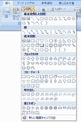図形」ボタンから始めます。「図形」ボタンを押すと、次のような標準図形が用意されています。図形描画の方法については後に詳しく触れることにします。