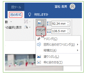 写真を選択した後、右図のように「図の形式」~「トリミング」をクリックすると、トリミング・図形に合わせてトリミング・縦横比を指定してトリミングの3つの方法で指定できます。ここでいう(単なる)トリミングは、縦横の寸法(画素数)を意識しないという意味です。
