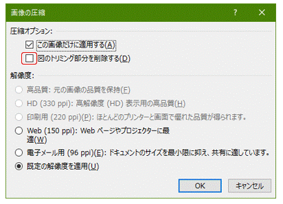 トリミングした部分を削除するには画像を選択して、「図の形式」~左方「調整」グループの「図の圧縮」をクリックします。右図が出るので「図のトリミング部分を削除する」に、チェックを付けて「OK」を押します。