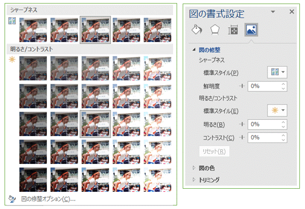 写真のシャープネス/明るさ/コントラストの調整をしてみましょう。写真を選択~「図の形式」~左方「調整」グループの「修整」をクリックすると下図左が現れます。任意の写真をクリックすることで容易に写真の修整ができます。最下段の「図の修整オプション」から、下図右「図の書式設定」も利用できます。