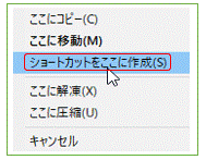 右クリックして、そのままデスクトップの何もないところに「ドラッグ&ドロップ」します。右図のようなサブメニューで「ショートカットをここに作成」をクリックします。ただ、このドラッグ&ドロップは最終場所にたどり着く前に、はずみで意図しないフォルダにドロップしてしまう危険性はあります。そうなるとそのフォルダを探すのに苦労します。