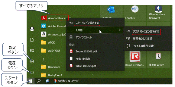 ショートカットになります。「スタート」画面や「タスクバー」を選んでおくこともできます。下図のように任意のアプリ(ここでは Acrobat Reader)を右クリックして、「スタートにピン留めする」や、必要なら「その他」にマウスを移動して「タスクバーにピン留めする」こともできます。