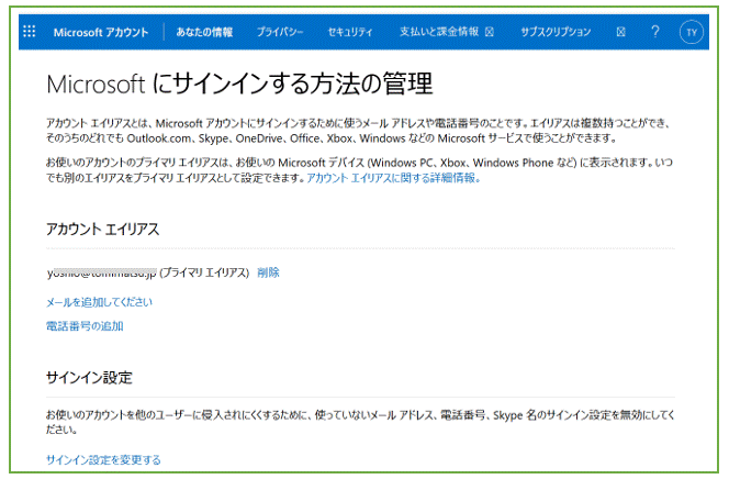 などには多くの人は気付かないでしょう。そんなときのために「Microsoftにサインインする方法の管理」という画面を見ることにしましょう。
