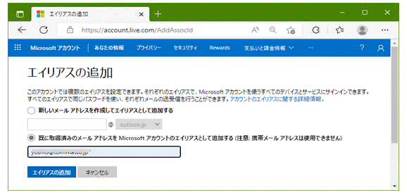 「Microsoftにサインインする方法の管理」画面では、何の説明もなくいきなりメールアドレスを「エイリアス」と呼び、メールを追加するための「エイリアスの追加」画面もあります。すなわち、メールアドレスを実体のない「エイリアス」として扱っています。言い換えれば、設定したメールアドレスは「エイリアス」であり、「Microsoftアカウント」は単なる「テキスト」となって保存される仕組みにしていると推測します。