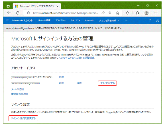 下図「Microsoftにサインインする方法の管理」画面には、現在指定しているメールアドレスや電話番号が表示されています。ここではMicrosoftアカウントに関連付けられるメールアドレスや電話番号を「エイリアス」と呼びます。「エイリアス」は複数存在できますが、そのうち一つを「プライマリエイリアス」として設定します。