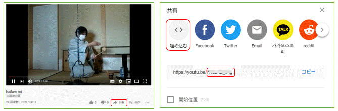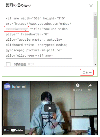 すると、右図上の「埋め込みコード」(htmlコード)が表示されます。右下の「コピー」ボタンを押してコードをコピーします。そのままWebページに「Ctrl+V」などで貼り付けて、これをブラウザで見ると右図下のように表示されます。<埋め込みパラメータの調整>