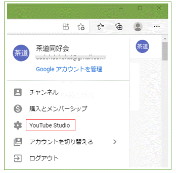 YouTubeホーム画面に移り、右図の右上にある自身のアカウントを示すアイコン、例えば「茶道」をクリックします。現れるメニューから「YouTube