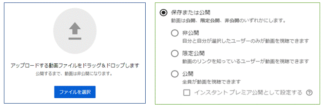 次へ」ボタンを押します。下図右の「公開」の設定画面では、いずれか1つを指定します。 この指定は動画のアップロードが終わった後からでも変更することもできます。プライバシーが気になるなら「