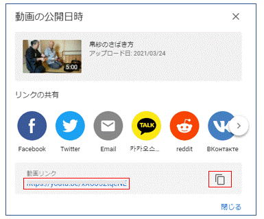 保存」ボタンを押せば、アップロードは終了です。アップロードが完了すると、下図のような「リンクの共有」画面が現れます。動画をSNSで共有したり、「動画リンク」の